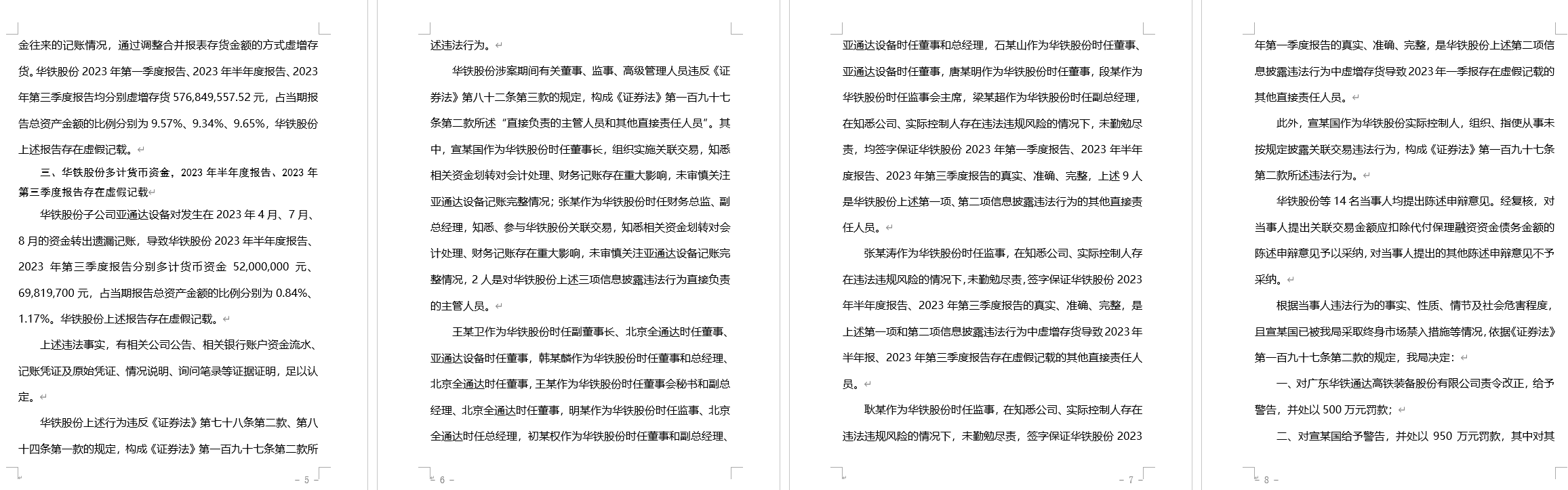 决定书显示,广东华铁通达高铁装备股份有限公司存在以下违法事实:华铁股份未按规定披露关联交易,华铁股份2023年半年度报告存在重大遗漏华;华铁股份虚增存货,2023年第一季度报告、2023年半年度报告、2023年第三季度报告存在虚假记载;华铁股份多计货币资金,2023年半年度报告、2023年第三季度报告存在虚假记载。上述行为违反了《证券法》的相关规定。