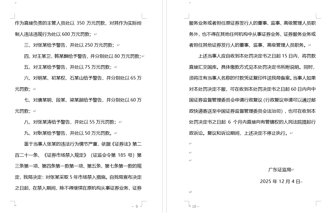 针对以上问题,广东证监局决定对广东华铁通达高铁装备股份有限公司责令改正,给予警告,并处以500万元罚款;对宣某国给予警告,并处以950万元罚款;对张某给予警告,处以250万元罚款,并采取5年市场禁入措施;对王某卫、韩某麟给予警告,并分别处以80万元罚款;对王某给予警告,并处以75万元罚款;对明某、初某权、石某山给予警告,并分别处以65万元罚款;对唐某明、段某、梁某超给予警告,并分别处以60万元罚款;对张某涛给予警告,并处以55万元罚款;对耿某给予警告,并处以50万元罚款。