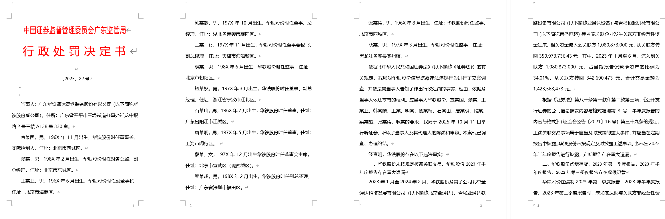 蓝鲸新闻12月13日讯,近日,广东证监局发布行政监管措施决定书股速查,剑指广东华铁通达高铁装备股份有限公司及其相关责任人。